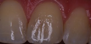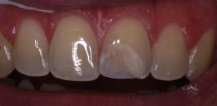 A seguito di trauma in sede frontale si distacca frammento dell'incisivo centrale superiore di sinistra e si incrina il corrispondente di destra (visibili nella foto prima del trattamento).